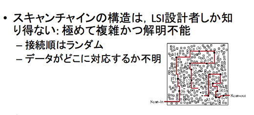 ICカードにとって特に脅威となりうると考えているのは、「スキャンベース攻撃」と呼ばれるサイドチャネル攻撃です。集積回路のことを総称してLSIと呼んでおり、入力された情報を計算する「組み合わせ回路」と、計算結果を記憶する「FF(フリップフロップ)」という素子で中身が構成されています。言葉の上では単純に思えますが、実際の回路はとても複雑な構造になっているため、正しく動作しているかどうか確かめることは、まずできません。そのため設計者は、計算途中の結果を覗き見ることができる「スキャンチェイン」を通して、きちんと動いているかどうか確認するのです。しかし、このスキャンチェインは、設計者が正常に動作しているのか確認できると同時に、第三者も同じ内容が確認できてしまうという、諸刃の剣でもあります。こうして得た情報を使って、悪意を持った第三者によって暗号が解明されてしまうかもしれません。ですが、これまでスキャンベース攻撃の危険性はほとんどないものだと考えられてきました。