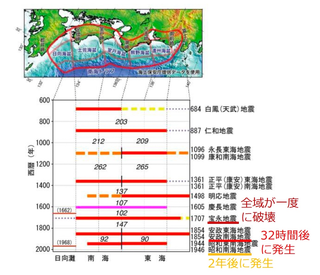 文部科学省地震調査研究推進本部による「南海トラフの地震活動の長期評価(第二版)」より、過去の南海トラフでの地震の記録。南海トラフにおける地震には、複数の異なる発生パターンがあることが分かる