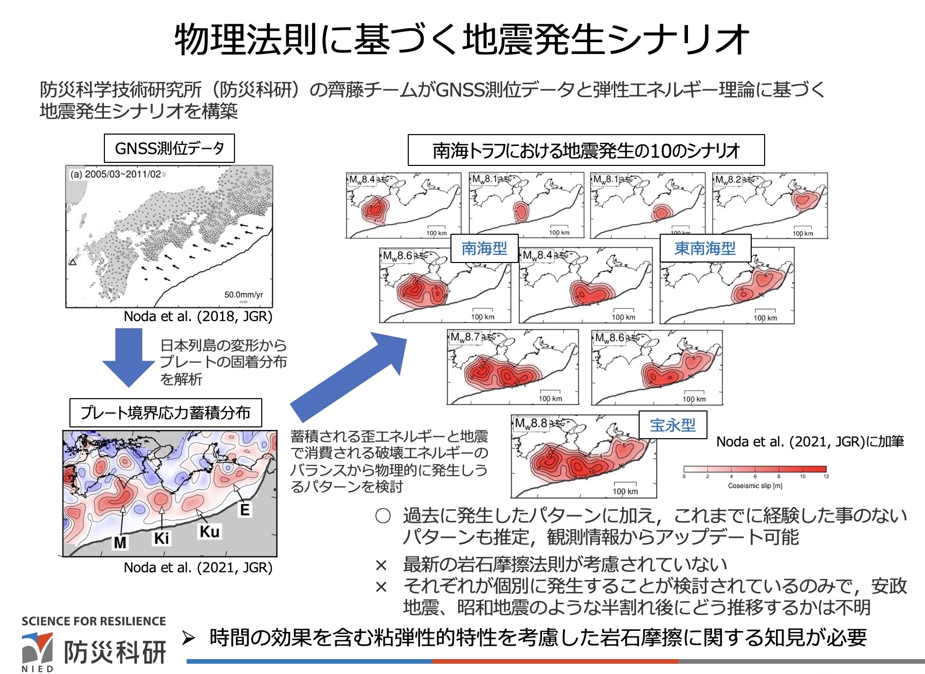 このように南海トラフでは、地震が毎回同じ単位で起こるわけではなく、時間推移を伴う複雑な発生機構が見られます。したがって、履歴からの予測には限界があるのです。私たち防災科学技術研究所の研究チームは、過去の記録だけでなく、最新の観測データと物理法則に基づいた地震の予測が必要であると考え、研究を進めてきました。