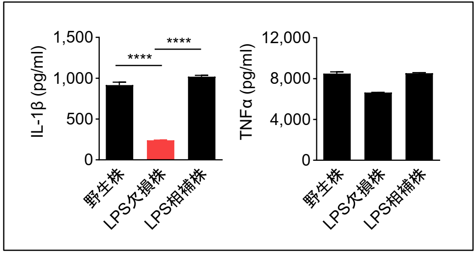 MRSA感染において、インフラマソーム応答の中心となるcaspase-11は、グラム陰性菌のLPSに対する細胞内受容体として知られています。そこで、LPSがインフラマソーム応答の誘導に関与している可能性を考えて、アシネトバクターのLPS合成酵素を欠損した変異株(LPS欠損株)をマクロファージに感染させ、野生株を感染させた場合と比較しました。その結果、野生株感染の場合に比べて、LPS欠損株ではIL-1βの産生量が激減したのに対し、インフラマソームに基づかないTNFαの産生量には、大きな変化が見られませんでした。