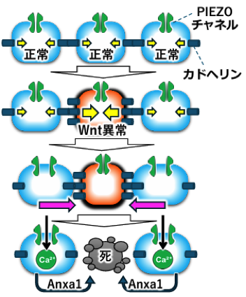 Wntシグナルの異常活性化がカドヘリン量を増加させた結果、細胞間張力が特定の領域で異常に高くなり、隣接細胞が前がん細胞に接近。この動きが物理的なストレスとなり、隣接細胞のカノセンシティブカルシウムチャネル「PIEZO」が開口、そこからカルシウムイオンが流入した結果、Annexin A1が放出、最終的に前がん細胞の細胞死が誘導される
