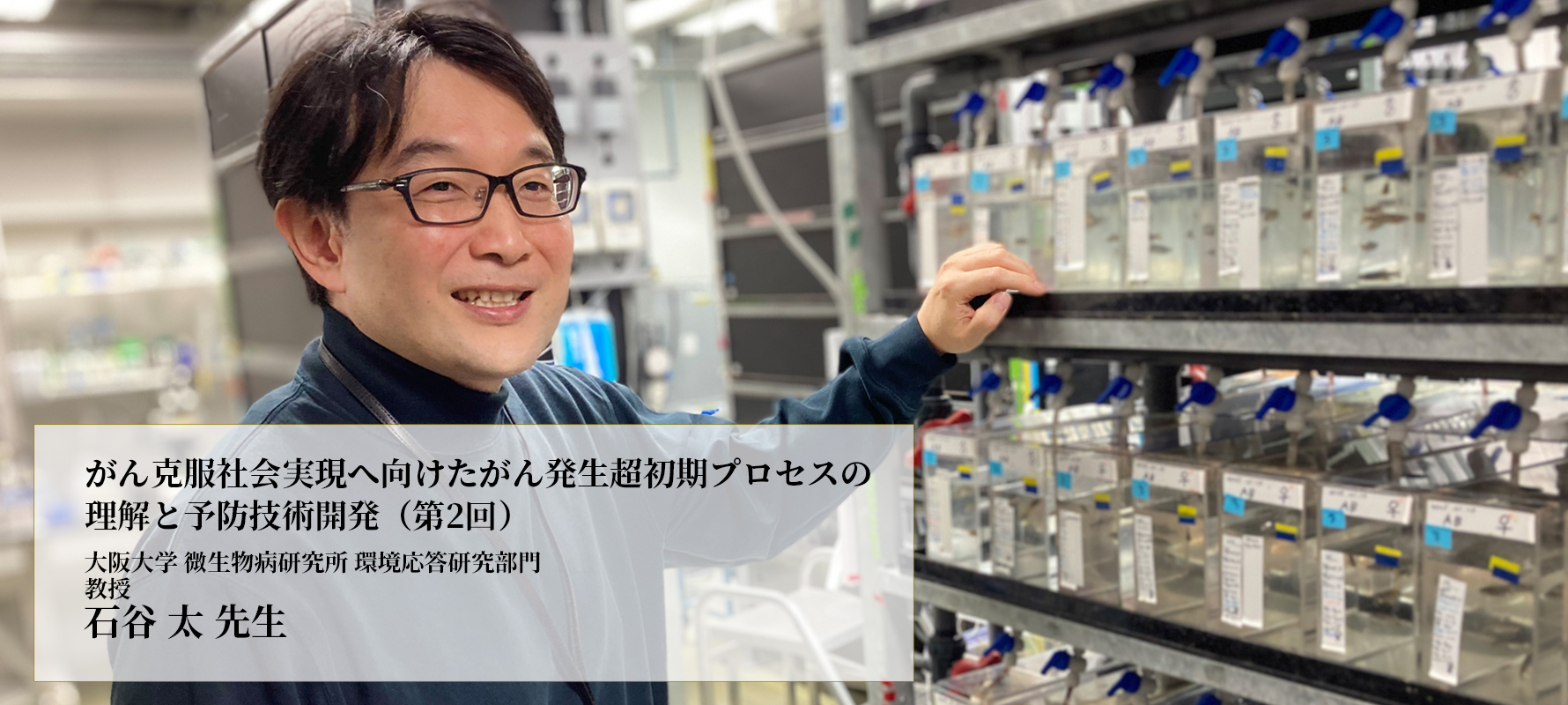 この課題に対して、石谷先生はゼブラフィッシュ実験系を活用して「がん発生超初期」の解明に取り組まれました。最終的には、ヒトのがん予防技術の、シーズの創出を目指しています。