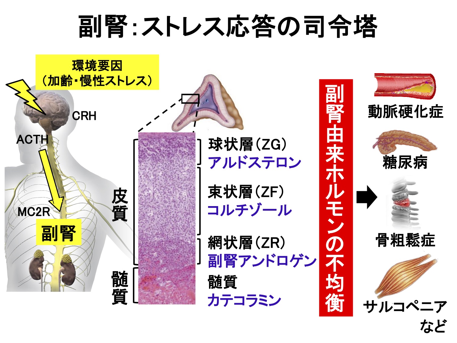 副腎皮質から分泌されるホルモンは、さまざまな生活習慣病に関わっている。本研究では骨粗鬆症にフォーカスしているが、その成果をもとに他の疾患にもアプローチしていく
