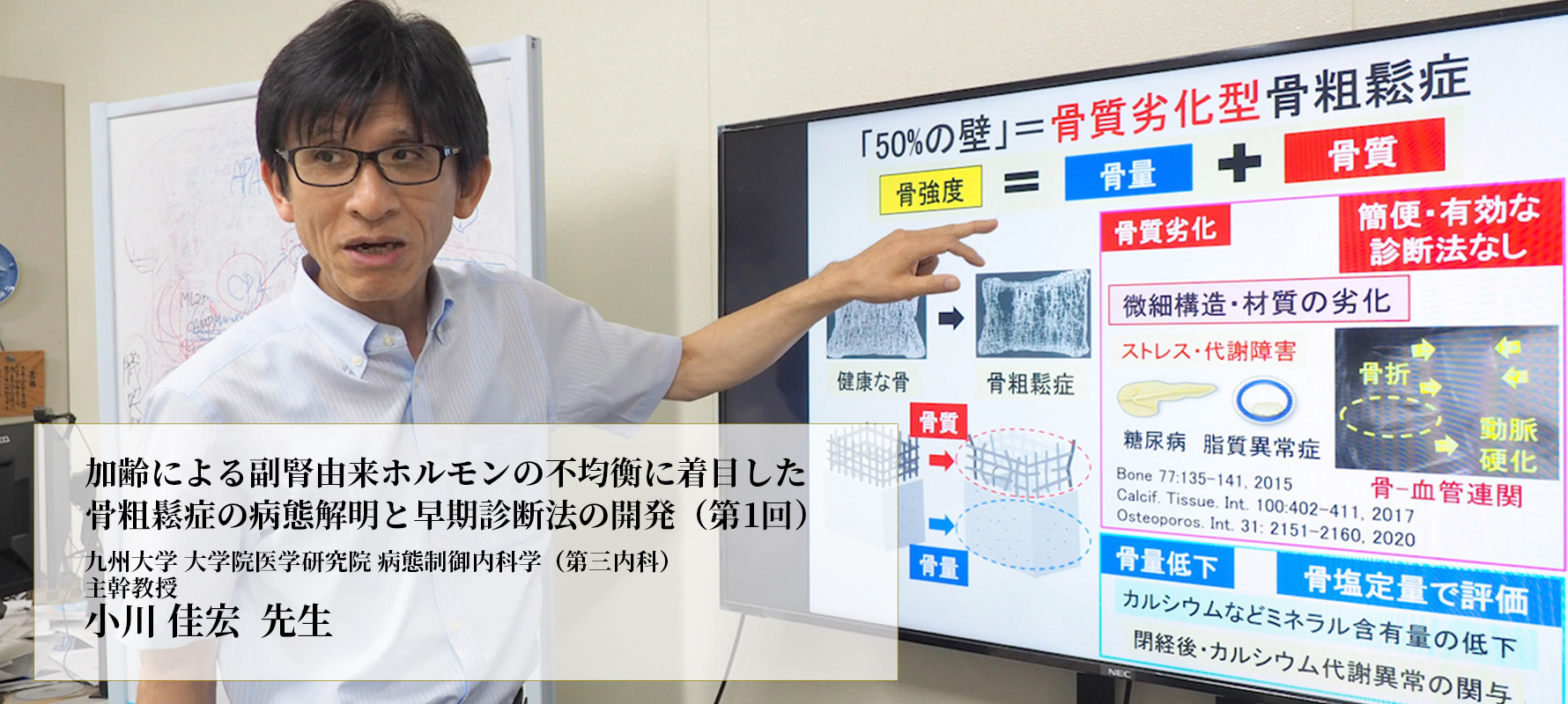 九州大学大学院医学研究院病態制御内科学の小川佳宏先生は、内分泌・代謝学を基盤とした基礎・臨床研究に取り組む中で、副腎から分泌されるホルモンが骨質の劣化に関係していることを見出しました。骨粗鬆症の発症に副腎がどのように関わっているのか、お話を伺いました。