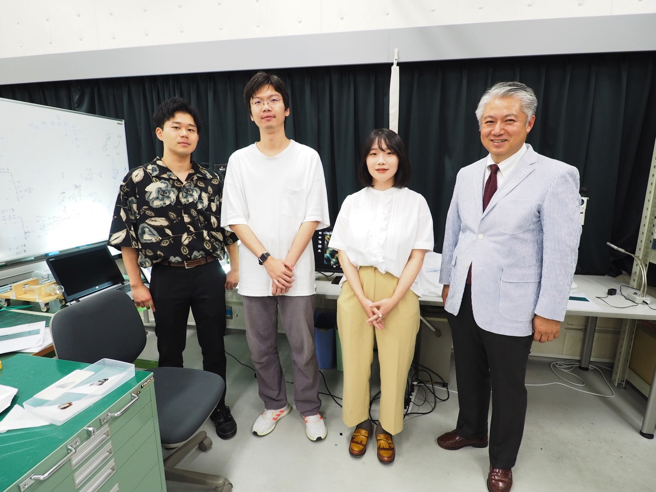 航空宇宙工学専攻・航空宇宙力学講座の学生たちと。学生たちは、シミュレーションや実験用のロボットの作成など、それぞれの得意分野を生かして研究に参加している