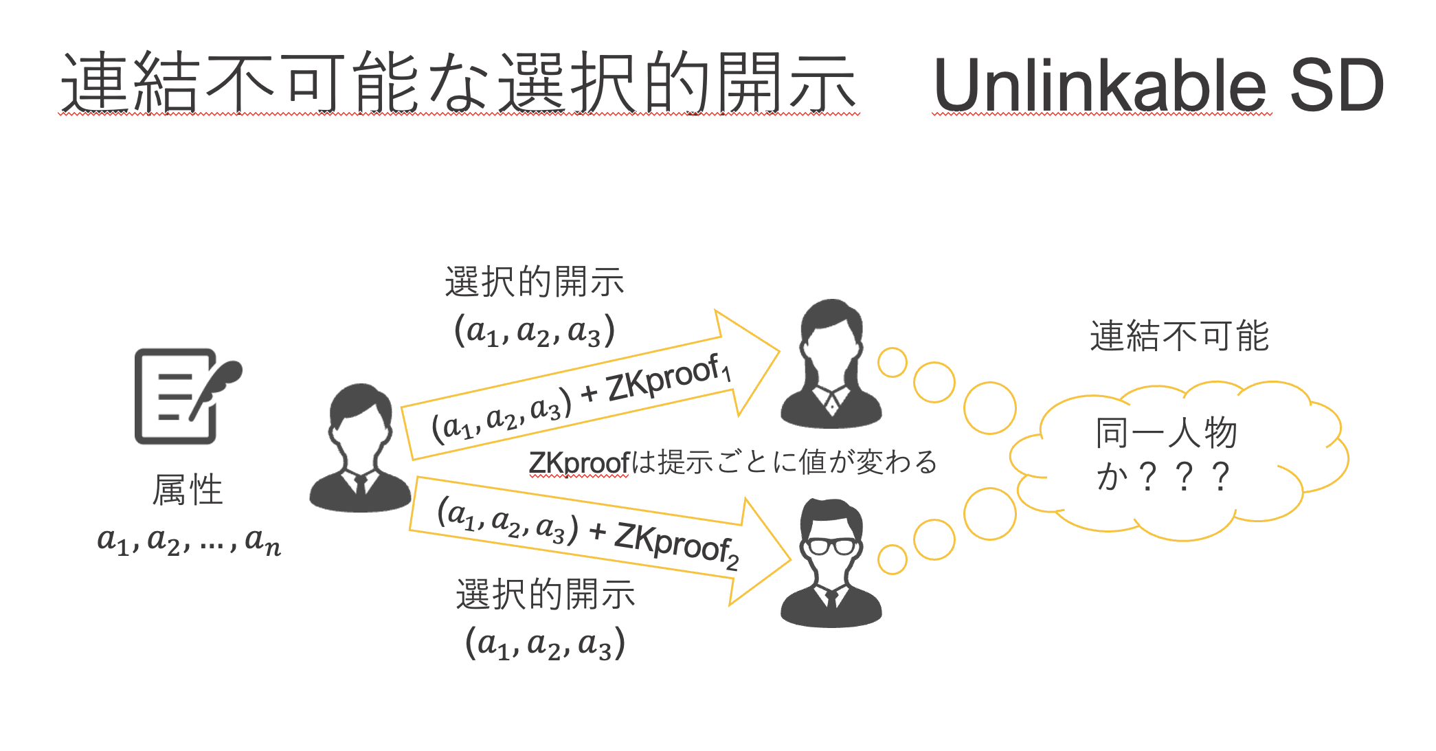 開示するたびに新しいZKproofが作成されますから、ある人が複数回同じ情報を開示したとしても、データ上では同一人物か、同じ属性を持つ他人かどうか判別できない仕組みです。この技術は「連結不可能選択的開示(Unlinkable SD)技術」と呼ばれています。
